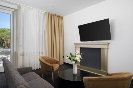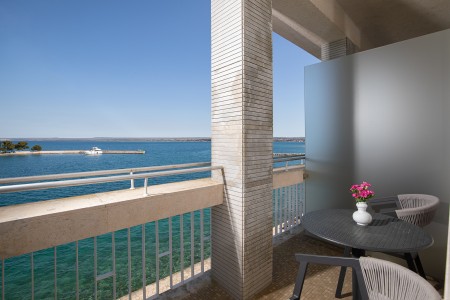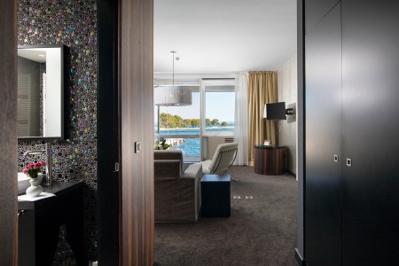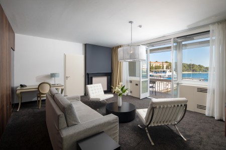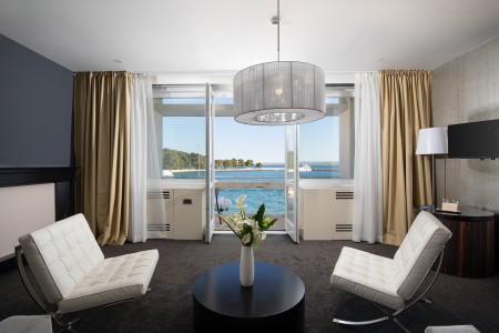 Suite: cca 50 m², spavaća soba s bračnim krevetom, dnevni boravak sa sofom, dvije kupaonice, jedna s walk-in tušem, druga s kadom. Balkon s pogledom na more.