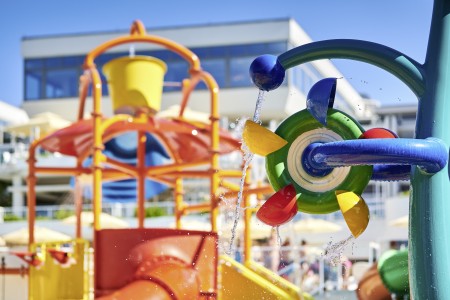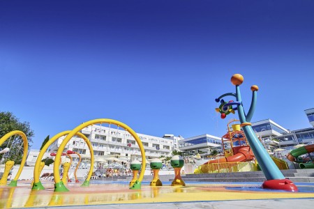 Plaža: Do stjenovite plaže s kamenim površinama, hladnjacima za ležanje i velikim toboganom za vodu (uz nadoplatu) ima oko 80 m kroz park.