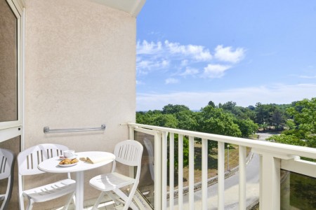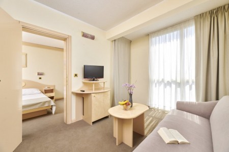 Suite: cca 31 m², spavaća soba i dnevni prostor s kaučem na razvlačenje (110x180 cm), balkon prema parku ili moru.