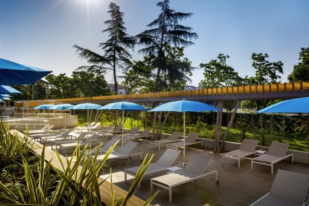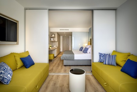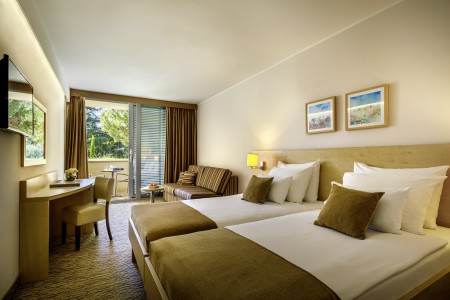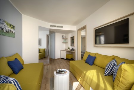 Junior obiteljska suita: otprilike 28-32 m², soba s bračnim krevetom ili dva odvojena kreveta, dnevni boravak s bračnim kaučem na razvlačenje (160x200 cm) i radnim stolom, kupaonica/WC, balkon. Moguća rezervacija s pogledom na park ili more.