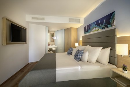 Dvokrevetna soba: otprilike 22 m², s bračnim krevetom ili dva odvojena kreveta, balkon s pogledom na park ili more, moguća rezervacija kao jednokrevetna soba. Dvokrevetne sobe s dodatnim ležajem (dodatni ležaj za jednu osobu ili bračni kauč) su malo veće i imaju pogled na park ili more.