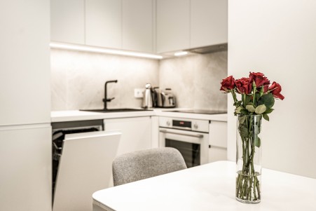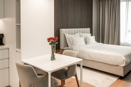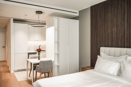 Studio Deluxe: cca. 32-34 m², s bračnim krevetom (160x200 cm) i vrhunski opremljenom kuhinjom (hladnjak, perilica posuđa, pećnica i ploča za kuhanje, aparat za kavu), mali blagovaonski kutak, uz klima-uređaj, pametni SAT-TV, sef, perilicu/sušilicu rublja, WiFi internet (besplatno) te tuš/WC. Dječji krevetić na upit bez nadoplate.