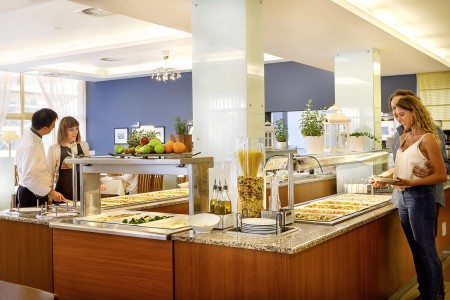 Usluga: Buffet doručak. Mogućnost polupansiona s večernjim buffetom uz nadoplatu. U razdoblju od 01.06.-01.09. 2x tjedno tematske večere - Dalmatinska večer s glazbom uživo, večer s glavnim kuharom uz glazbu uživo.