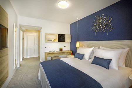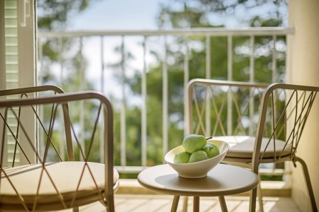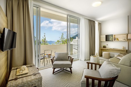Junior Suite: otprilike 32 m², jedna spavaća soba s bračnim krevetom, zasebni dnevni boravak s kaučem na razvlačenje za dvije osobe (170 x 96 cm), kupaonica, balkon, s pogledom na more.