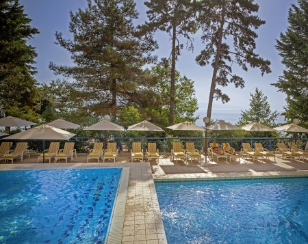 Plaža: Vlastitu hotelsku stjenovitu plažu sa stjenovitim pločama možete doći koristeći stepenice. Ležaljke i suncobrani su besplatni (ograničen broj).