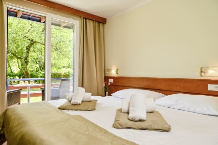Dvokrevetna soba: cca. 16 m², bračni krevet ili dva odvojena kreveta (2x 190x80 cm), kupaonica s tušem/WC, WiFi internet (besplatno), SAT-TV i klima uređaj. Balkon s pogledom na park. Besplatno parkirno mjesto u blizini bungalova za jedan automobil.