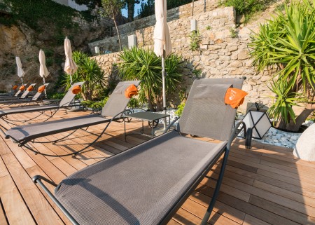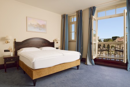 Deluxe suite: oko 38-42 m², spavaća soba s bračnim krevetom (180 x 200 cm), prostran dnevni boravak s kaučem na razvlačenje za jednu osobu (140 x 180 cm), balkon s pogledom na more.