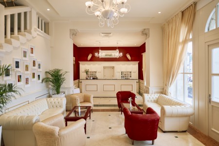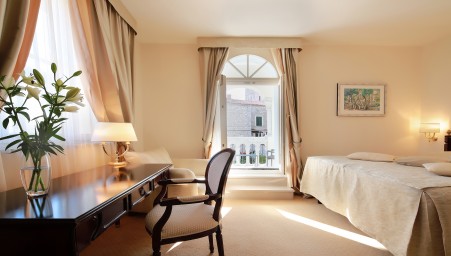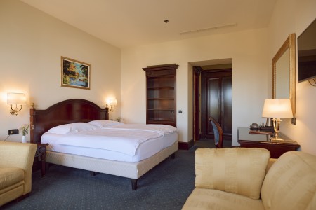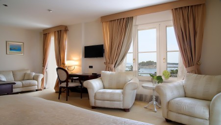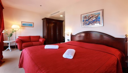 Prezidentski suite: oko 60 m², na trećem katu, spavaća soba s bračnim krevetom (180 x 200 cm), prostran dnevni boravak s uredom i kaučem na razvlačenje za jednu osobu (140 x 180 cm), balkon s pogledom na more.