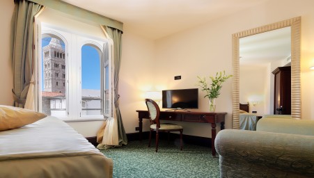 Klasična jednokrevetna soba: oko 18 m², jedan krevet (120 x 200 cm), pogled na staru gradsku jezgru.