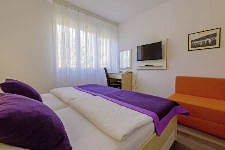 49 soba u hotelu: otprilike 14 m², moderno i ugodno uređene, klima uređaj, satelitska TV, telefon, WiFi internet (besplatno) i tuš/WC. Besplatni dječji krevetić na upit.