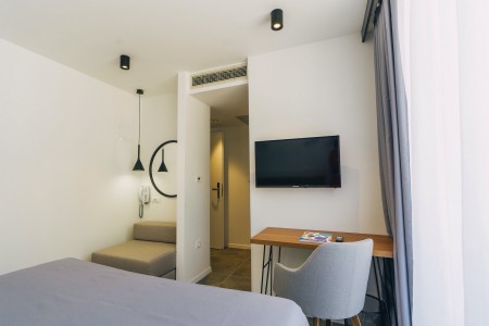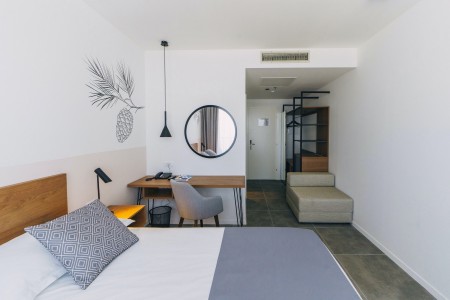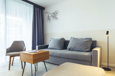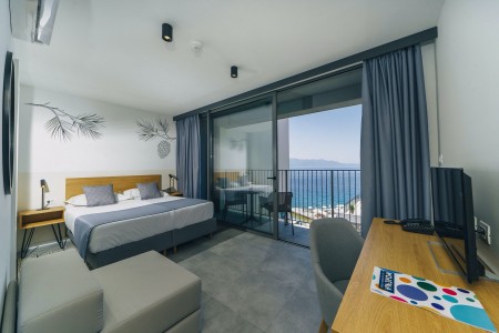 Suite: oko 40 m², s jednom spavaćom sobom s bračnim krevetom, jednom spavačom sobom s odvojenim krevetima, dnevnim boravkom s kaučom na razvlačenje, s balkonom ili balkonom s pogledom na more.