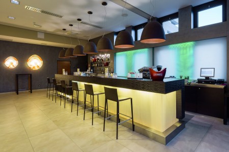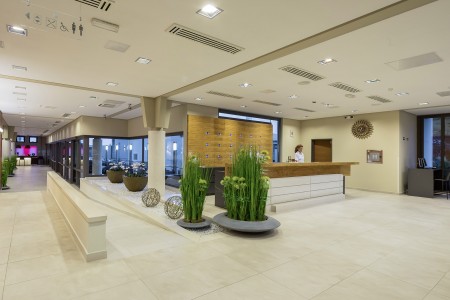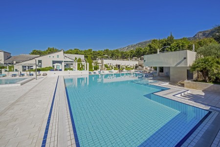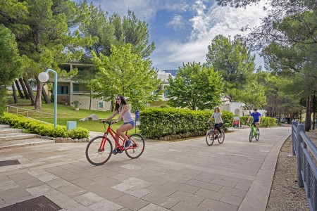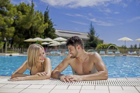 Uređaji: Restoran, lobi bar, specijalizirani restorani "Komin" i "Konoba" (sezonski otvoreni), pizzerija (otvoreno od svibnja do rujna), kafić, kiosk, seminar prostorije, plesni klub. Slatkovodni bazen s vodenim toboganom i zasebnim dječjim bazenom, grijani bazen za opuštanje, sunčana terasa, bar kod bazena, ležaljke i suncobrani (uključeno, ograničen broj), kupaći ručnici (uključeno, uz depozit). U srpnju i kolovozu bogat program animacija za djecu i mladež različitih dobnih skupina s 'pool parties', sportske olimpijade, itd. Nečuvana parkirališna mjesta na području hotela. Dvije punionice za električna vozila (uz naplatu) dostupne. Internet kutak dostupan na recepciji / u predvorju (besplatno), WiFi internet dostupan u području recepcije, lobi bara i na bazenu (besplatno).