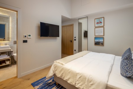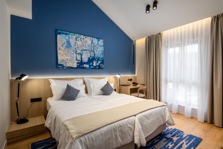 22 Sobe: moderno uređene, sadrže bračni krevet ili dva odvojena kreveta, klima uređaj, minibar, radni stol, sef, SAT TV, telefon i sušilo za kosu, te kupaonicu s tušem i WC-om. Dječji krevetić na upit