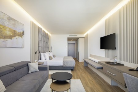 Dvokrevetna soba Luxury: cca 34–42 m², bračni krevet, dodatni ležaj (140x190 cm) za jednu odraslu osobu ili do dvoje djece do 17,99 godina, balkon s pogledom na more.