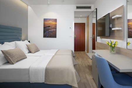 Dvokrevetne sobe: otprilike 18-24 m², moguće ih je rezervirati s balkonom i pogledom na planine, s balkonom i bočnim pogledom na more ili s terasom na morskoj strani s direktnim pogledom na more.
