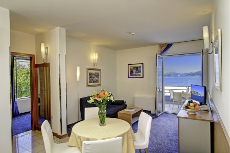 15 Apartmana: cca. 44-50 m², moderan i udobno uređene, jedna dvokrevetna soba, dnevni boravak sa sofom za spavanje (dodatni krevet za 4. osobu moguć), SAT-TV, klima uređaj, telefon, WiFi internet (besplatno), minibar, sef, tuš/WC i balkon s pogledom na more.