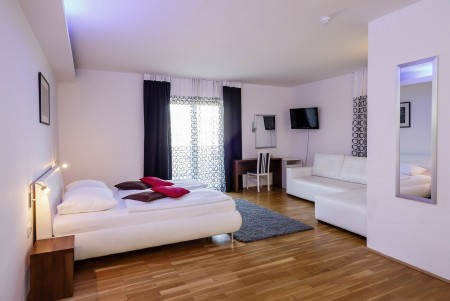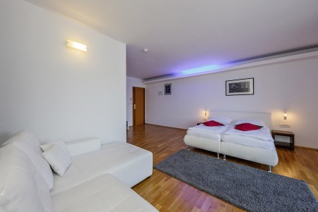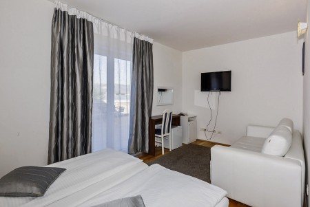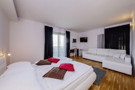 10 apartmana: cca. 45 m², sastoje se od dvokrevetne sobe i dnevnog boravka s dvostrukim kaučem na razvlačenje, moderno i ukusno uređene s klima uređajem, telefonom, WiFi internetom (besplatno), LED SAT-TV-om, minibarom, sefom, kupaonicom ili tušem/WC-om, balkonom ili terasom.