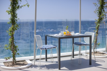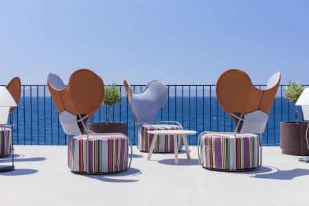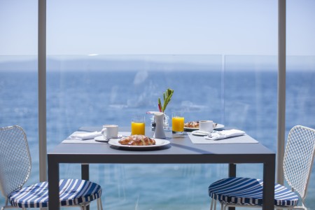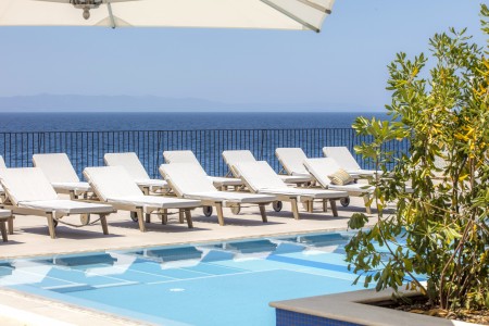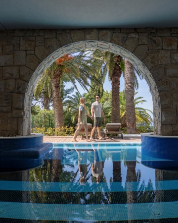Deluxe Junior Suite Swim Up: oko 35 m², dodatno s prostorom za sjedenje s kaučem na razvlačenje (150x190 cm) za još jednu osobu, kupaonicom s tušem i odvojenim WC-om te namještenom terasom s pogledom na more i pristupom zajedničkom natkrivenom Swim-Up bazenu (oko 60 m² ukupno).