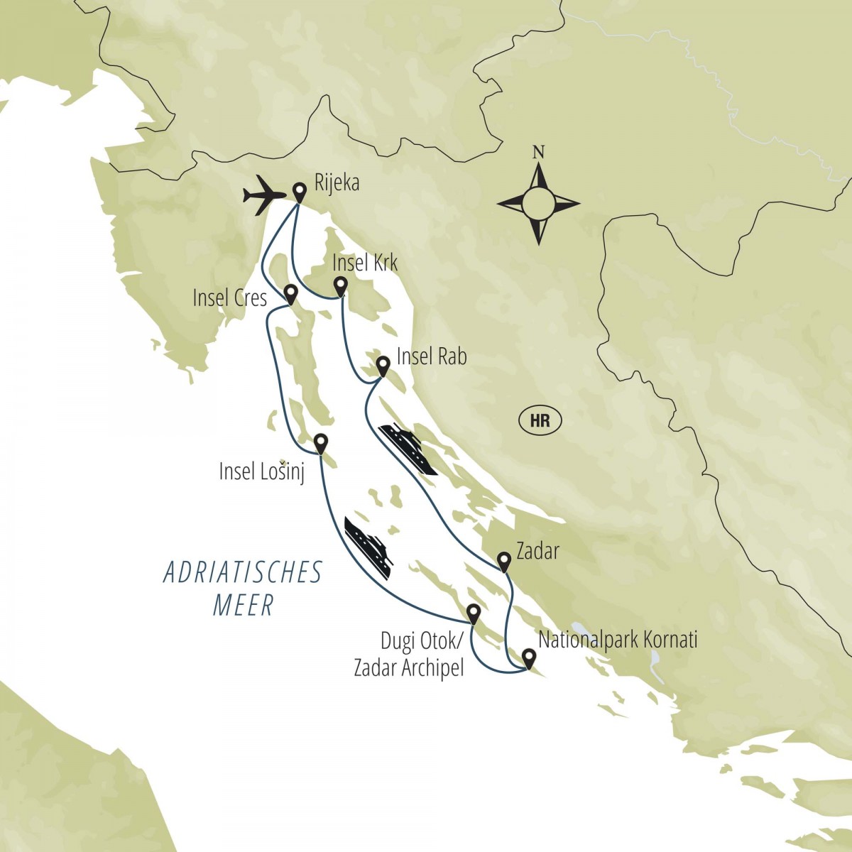 Rijeka – Otok Krk – Otok Rab – Zadar – Nacionalni park Kornati – Zadar-arkipelag – Otok Lošinj – Otok Cres – Rijeka