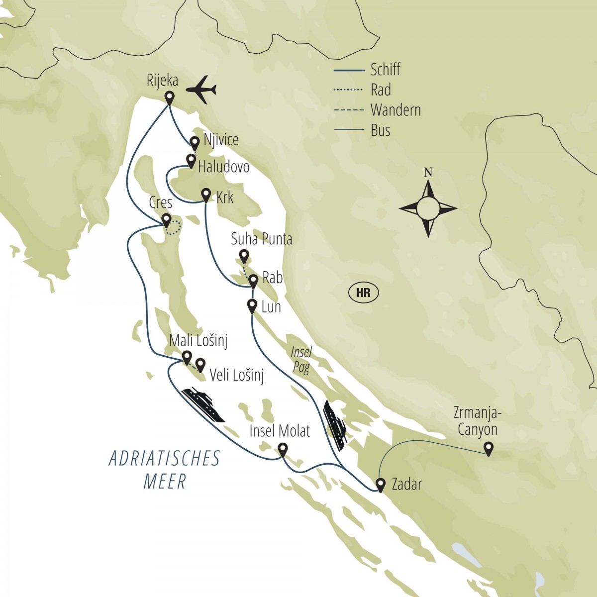 Ruta: Rijeka – otok Cres – otok Lošinj – otok Molat – Zadar – kanjon rijeke Zrmanje (kajak safari) – otok Pag – otok Rab – otok Krk – Rijeka