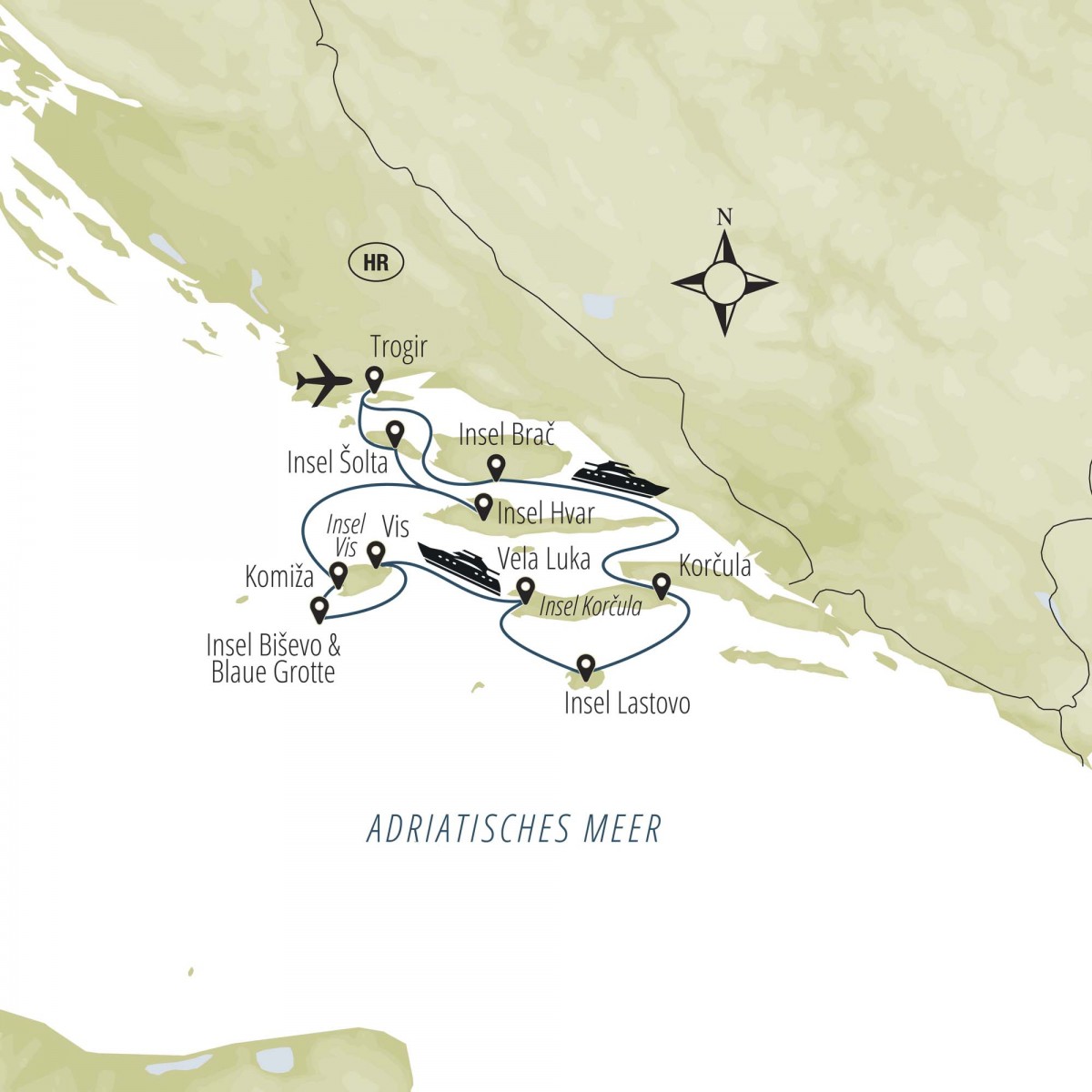 Trogir – Otok Brač – Otok Korčula – Otok Lastovo – Otok Korčula (Vela Luka) – Otok Vis – Otok Biševo – Otok Vis (Komiža) – Otok Hvar – Trogir