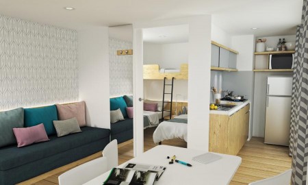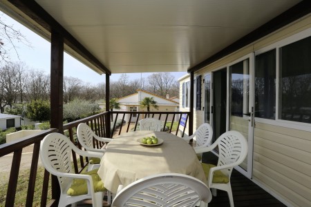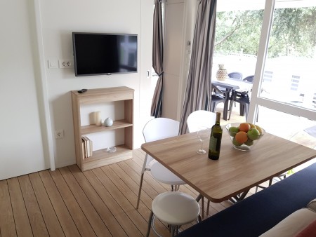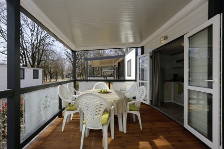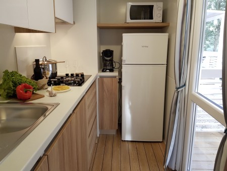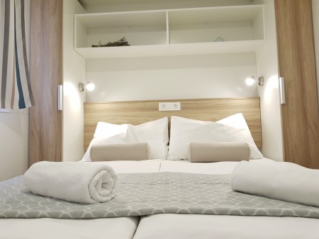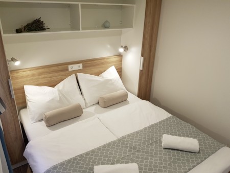 Mobilna kućica Comfort za 6 osoba: približno 32 m², spavaća soba s bračnim krevetom, dvije dodatne sobe svaka s dva odvojena kreveta, dnevni boravak s kuhinjom (hladnjak s ledenicom, plinski štednjak, sudoper, mikrovalna pećnica, aparat za kavu), dnevni boravak, blagovaonica za 6 osoba, kupaonica s tušem/WC, odvojeni WC, klima uređaj, SAT-TV i WiFi (besplatno). Natkrivena terasa (oko 18 m²) s stolom i šest stolica, dvije ležaljke te roštilj na drveni ugljen.