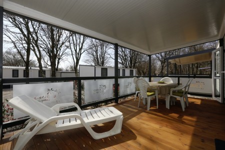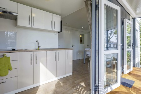 Premium mobilna kućica za 6 osoba: otprilike 34 m², spavaća soba s bračnim krevetom, dvije dodatne spavaće sobe svaka s po dva kreveta, dnevni boravak s kuhinjom (hladnjak sa zamrzivačem, plinski štednjak, sudoper, mikrovalna pećnica, aparat za kavu), prostor za sjedenje, blagovaonički prostor za 6 osoba, kupaonica sa tušem/WC-om, zaseban WC, klima uređaj, SAT-TV i WiFi (besplatno). Natkrivena terasa (otprilike 18 m²) s stolom i šest stolica, dvije ležaljke i roštilj na ugljen.