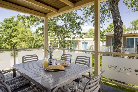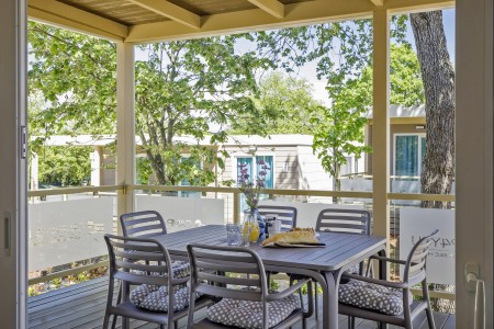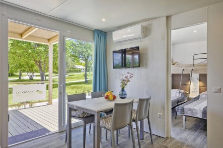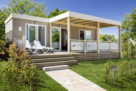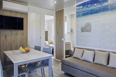 Mobilna kućica „Family Prestige“ za 4-6 osoba: otprilike 35 m², jedna spavaća soba s bračnim krevetom (160 x 200 cm), dvije spavaće sobe s po dva odvojena kreveta (80 x 200 cm svaki), dva kupaonica s tušem i WC-om, dnevni boravak / blagovaonica s potpuno opremljenom kuhinjom (kuhalište, mikrovalna pećnica, kuhalo za vodu, kafetijera, hladnjak s zamrzivačem, perilica suđa), velika natkrivena terasa (otprilike 26 m²) s garniturom za sjedenje i dvije ležaljke za sunčanje. Osim toga SAT-TV, klima uređaj, WiFi-Internet (besplatno) i rezervirano parkirno mjesto.