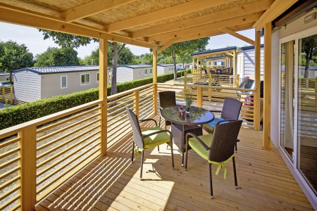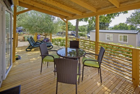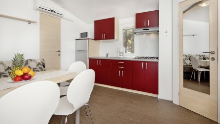Mobilna kućica „Lux“ za 4-5 osoba: oko 32 m², jedna spavaća soba s bračnim krevetom (160x200 cm), jedna spavaća soba s dva pojedinačna kreveta, dnevni boravak s klima uređajem, SAT-TV-om, kuhinjica s mikrovalnom pećnicom, perilicom suđa i aparat za kavu s filterom, blagovaonica (spavaće mjesto za jednu osobu), dvije kupaonice sa tušem/WC, natkrivena terasa s dvije ležaljke.