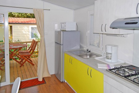 Mobilna kućica „Sun2“ za 2-3 osobe: otprilike 26 m² (uključujući terasu), spavaća soba s bračnim krevetom (otprilike 160x200 cm), dnevni boravak s klima uređajem, SAT-TV, kuhinjom s mikrovalnom pećnicom, perilicom posuđa i aparat za filter kavu, blagovaonica (mjesto za spavanje za jednu osobu), tuš/WC, terasa sa dvije ležaljke.