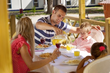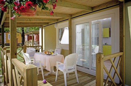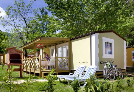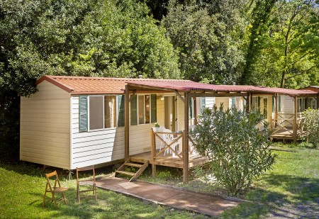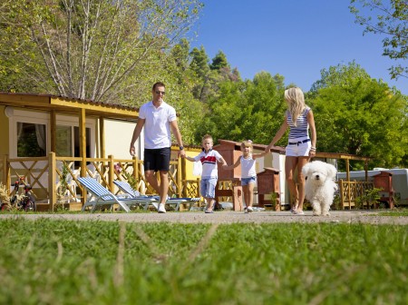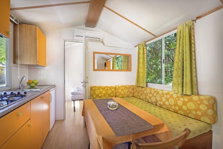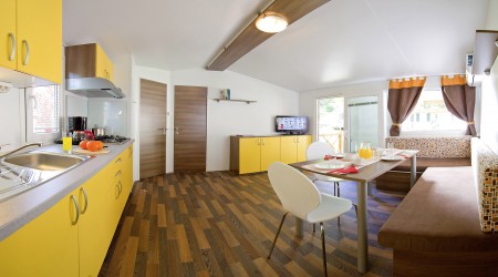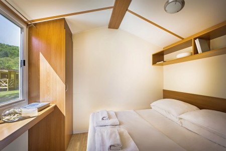 Mobilna kućica „Superior“ za 4 osobe: otprilike 32 m², moderno i udobno uređeno, jedna soba s bračnim krevetom, jedna soba s dva odvojena kreveta, dva kupatila sa tušem/WC, dnevni boravak s blagovaonicom i kuhinjom, natkrivena terasa s garniturom za sjedenje i roštiljem. Također, SAT TV, WiFi internet (besplatno) i klima uređaj. Parking pokraj mobilne kućice.