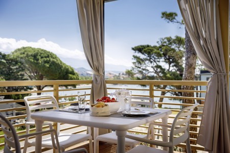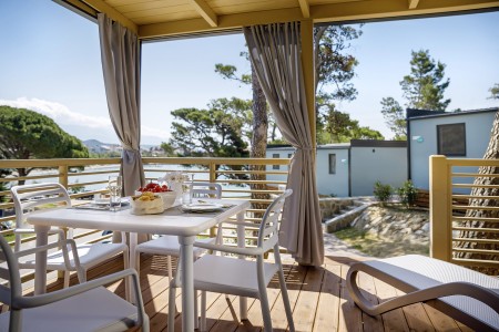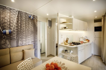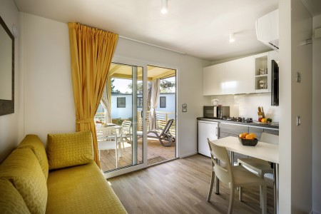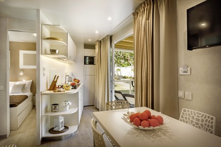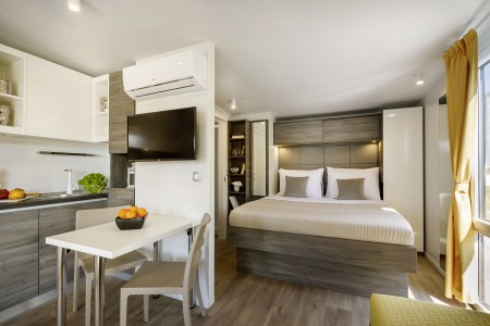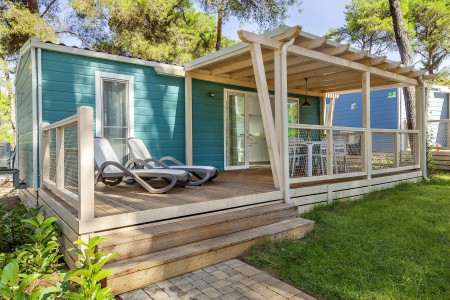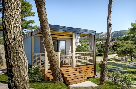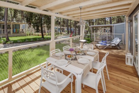 Mobilna kućica „Premium Exclusive Grand" za 4-6 osoba: cca. 36 m², jedna spavaća soba s bračnim krevetom (164x204 cm), jedna spavaća soba s dva odvojena kreveta (po 84x205 cm), dva kupaona s tušem i WC-om. Dnevni boravak s potpuno opremljenim kuhinjskim blokom (kuhalo, mikrovalna pećnica, aparat za kavu, kuhalo za vodu, hladnjak s zamrzivačem) i blagovaonskim stolom te stolicama, također s mogućnošću razvlačenja za dvije osobe. Prostrana natkrivena terasa (oko 25 m²) s garniturom za sjedenje i dvije ležaljke. Također SAT-TV i klima-uređaj. Parking za jedno vozilo u rezerviranom području, cca. 400 m udaljenom od mobilne kućice (besplatno).