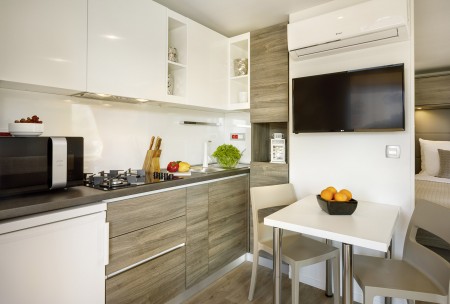 Mobilna kućica "Premium Exclusive Chalet" za 2-4 osobe: otprilike 20 m², dnevni boravak s bračnim krevetom i kaučem za spavanje za dvije osobe (može se odvojiti preklopnom vratom), potpuno opremljena kuhinjska niša (kuhalo, mikrovalna pećnica, aparat za kavu, električni čajnik, hladnjak s ledenicom) i blagovaonski stol i stolice. Kupaonica s tušem i WC-om. Natkrivena terasa (otprilike 12 m²) sa garniturom za sjedenje i ležaljkom za sunčanje. Uz to, klima uređaj. Nema televizora. Parkirno mjesto za jedno vozilo u rezerviranom području, otprilike 400 m od mobilne kućice (besplatno).
