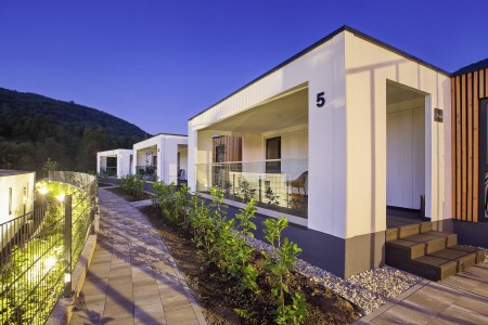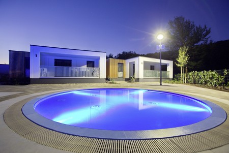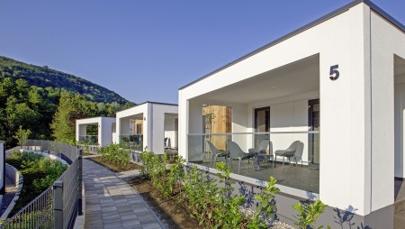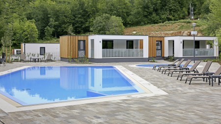 Mobilna kućica Deluxe za 4-6 osoba: cca. 36 m², moderno i visokokvalitetno opremljena, dvije dvokrevetne sobe, dnevni boravak s mogućnošću spavanja za dvije osobe, blagovaonica i potpuno opremljena kuhinjska niša s hladnjakom, štednjakom, mikrovalnom pećnicom i aparat za kavu, dva kupaonica s tušem i WC-om, natkrivena terasa (cca. 18 m²) sa garniturom za sjedenje. Uz to su na raspolaganju dva televizora sa satelitskim programom, WiFi internet (besplatan) i klima uređaj.