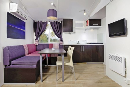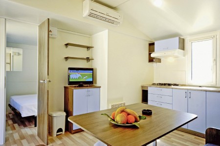 Mobilna kućica za 4-6 osoba: otprilike 32 m², jedna spavaća soba s bračnim krevetom (160 x 200 cm), jedna spavaća soba s dva jednostruka kreveta (80 x 190 cm svaki), dnevni boravak s kuhinjom (frizider, mikrovalna pećnica, štednjak) i blagovaonicom s kaučem na razvlačenje (133 x 190 cm) pogodnim za dvoje djece do 12 godina, tuš/WC, odvojeni WC, terasa s garniturom za sjedenje. Osim toga, klima uređaj i SAT TV.
