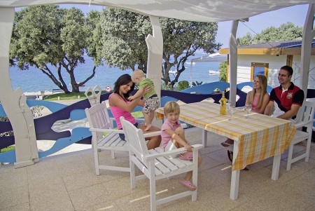 Mobilna kućica „Adria“ za 4-5 osoba: otprilike 34 m², dvije dvokrevetne sobe, dnevni boravak sa spavaćim dijelom, blagovaonica i kuhinjski blok s mikrovalnom pećnicom i aparat za kavu, dvije kupaonice s tušem i WC-om, terasa sa sjedećom garniturom i dvije ležaljke. Uz to, SAT-TV i klima uređaj. Može se rezervirati za 4 odrasle osobe i 1 dijete do 11,99 godina. Mobilne kućice „Adria“ smještene su u blizini kompleksa bazena, otprilike 50-100 m od mora.