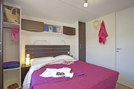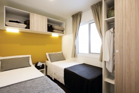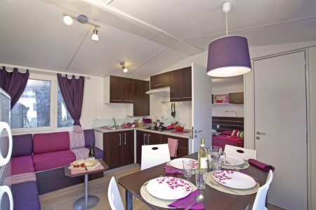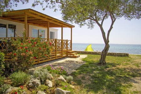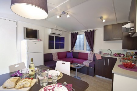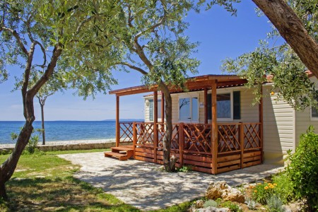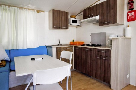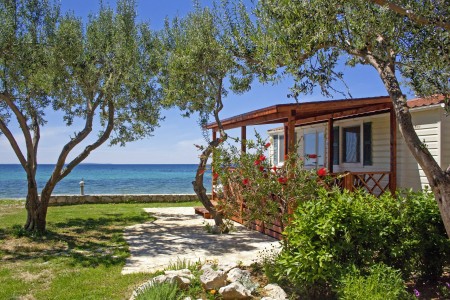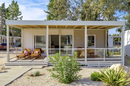 Mobilna kućica „Mediteran“ za 4-6 osoba: približno 34 m², dvije dvokrevetne sobe, dnevni boravak s ležajem, blagovaonica i kuhinjska niša s mikrovalnom pećnicom i aparat za kavu, dvije kupaonice s tušem i WC-om, terasa sa garniturom za sjedenje i dvije ležaljke. Također SAT-TV i klima uređaj. Može se rezervirati za 4 odrasle osobe i 2 djece do 11,99 godine. Udaljenost od mora je oko 150 m.
