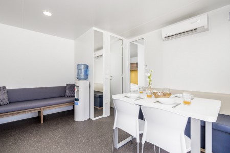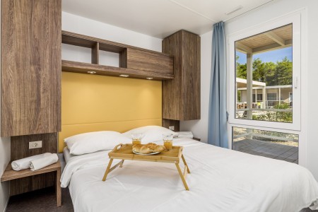 Mobilna kućica „Premium“ za 4-5 osoba: otprilike 34 m², dvije dvokrevetne sobe, dnevni boravak sa spavaćim mjestom, blagovaonica i kuhinja s mikrovalnom i aparatom za kavu, dva kupatila s tušem i WC-om, terasa sa sjedećom garniturom i dvije ležaljke. Također, SAT-TV i klima uključeni. Rezervacije za 4 odrasle osobe i 1 dijete do 11,99 godina. Mobilne kućice „Premium“ nalaze se blizu igrališta i plaže.