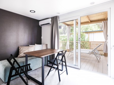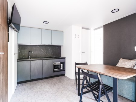 Mobilna kućica „Deluxe Family“ za 4-5 osoba: cca. 34 m², jedna spavaća soba s bračnim krevetom (160x200 cm), dvije spavaće sobe s po jednim krevetom (80x200 cm), dnevni boravak s ležajem za jednu osobu (klupa, 80x190 cm) i kuhinjska niša s mikrovalnom pećnicom, plinskim štednjakom sa 4 plamenika, perilicom posuđa, hladnjakom s ledenicom i kavomatom, dvije tuš kabine/WC, natkrivena terasa s garniturom za sjedenje. Također ima SAT TV i klima uređaj. Parkirališno mjesto uz mobilnu kućicu.