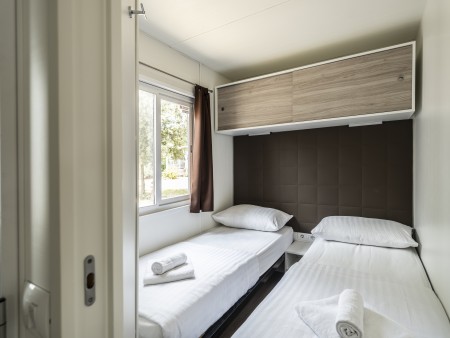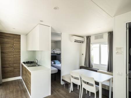 Mobilna kućica „Superior“ za 5-6 osoba: otprilike 34,4 m², jedna soba sa bračnim krevetom (145x200 cm), jedna soba s dva jednostruka kreveta (80x190 cm i 75x200 cm) i krevetom na kat (70x200 cm), dnevni boravak s ležajem (kutna klupa, 75x200 cm) za jednu osobu i kuhinjom s mikrovalnom pećnicom, plinskim štednjakom s 4 ploče za kuhanje i aparatom za kavu, dvije kupaonice/WC, djelomično natkrivena terasa sa sjedećom garniturom. Također, SAT TV i klima uređaj. Parkirno mjesto uz mobilnu kućicu. Udaljenost od plaže otprilike 500-950 m.