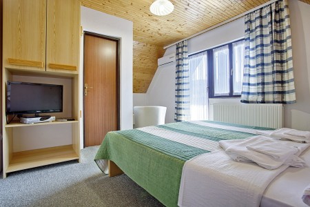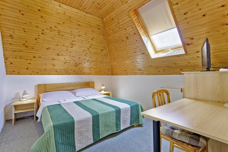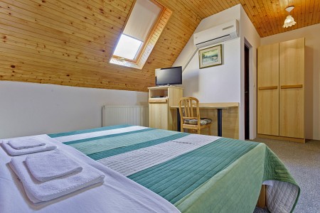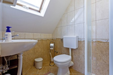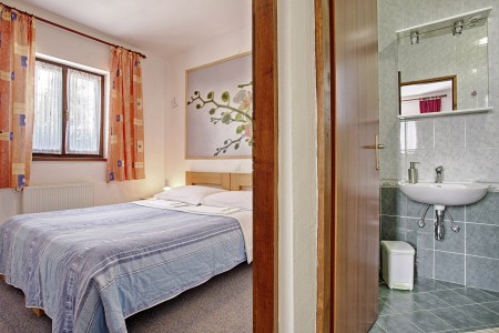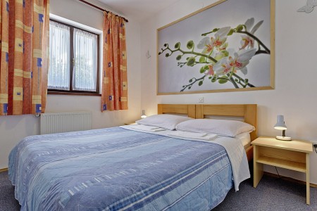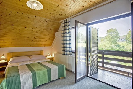 Dvokrevetna soba: cca 19 m² na drugom katu (potkrovlje), jedan bračni krevet, klima uređaj, SAT TV, centralno grijanje, kupaonica (tuš/WC), balkon s pogledom na vrt.