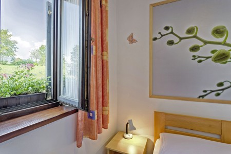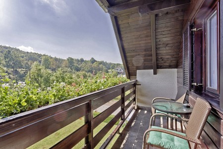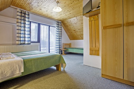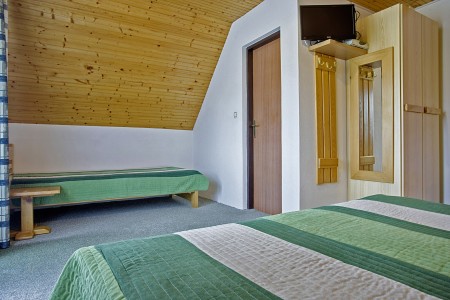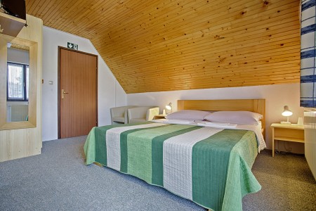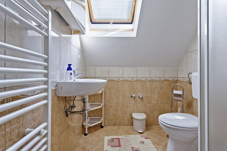 Trokrevetna soba: cca 21 m² na drugom katu (potkrovlje), jedan bračni krevet, jedan krevet za jednu osobu, klima, SAT-TV, centralno grijanje, kupaonica (tuš/WC), balkon s pogledom na vrt.