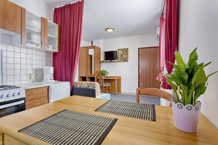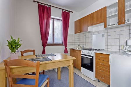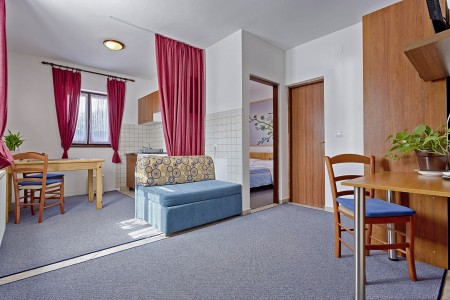 Apartman za 2 osobe: cca 28 m² na prvom katu, jedna spavaća soba s bračnim krevetom, dnevni boravak s klimom, SAT-TV, kauč, kuhinja i blagovaonica, centralno grijanje, kupaonica (tuš/WC).