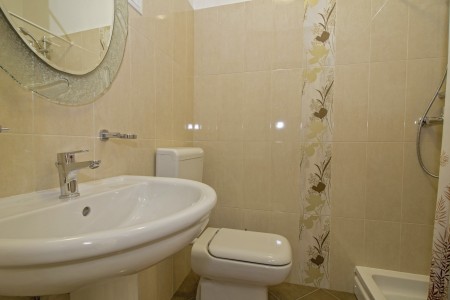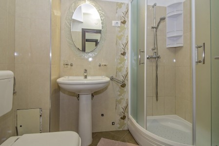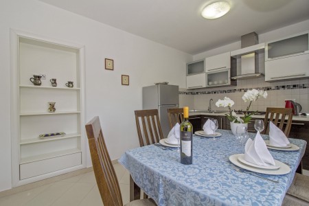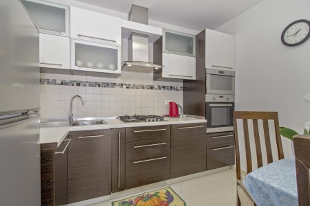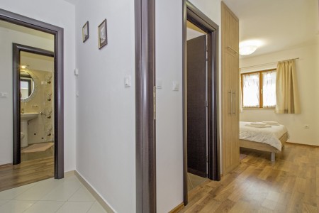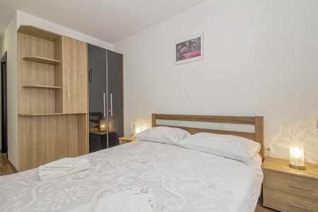 Apartman za 4-5 osoba: ca. 66 m², u prizemlju. Pažljivo uređen apartman nudi potpuno opremljenu kuhinju s blagovaonicom, dnevni boravak s klima uređajem i kaučem na razvlačenje (140 x 200 cm), te direktan izlaz na veliku terasu, dvije spavaće sobe s bračnim krevetima i dvije kupaonice (tuš/WC).