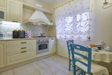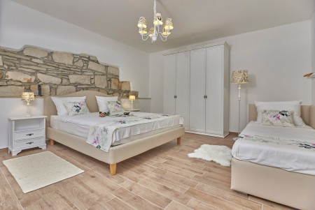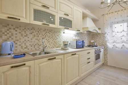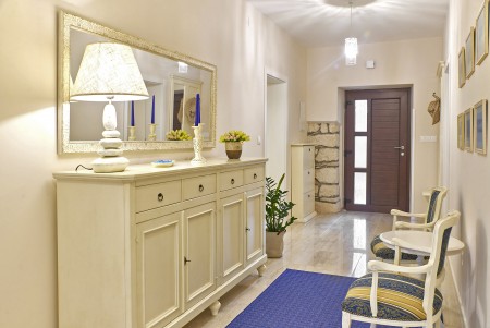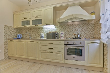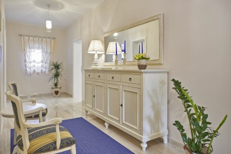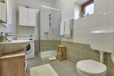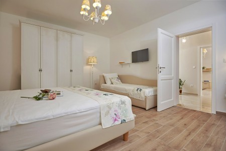 Apartman za 3-5 osoba: ca. 80 m² u prizemlju, moderno uređen. Ulazni hodnik, kompletno opremljena kuhinja, klimatizirani dnevni boravak, kauč na razvlačenje (180 x 200 cm), blagovaona i izlaz na natkrivenu terasu sa sjedećom garniturom. Velika spavaća soba s bračnim krevetom i krevetom za jednu osobu i kupaona (tuš/WC). Flat Screen-TV u dnevnom boravku i spavaćoj sobi.