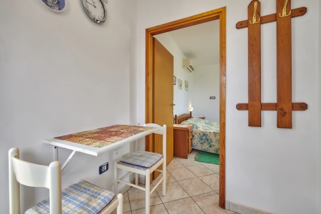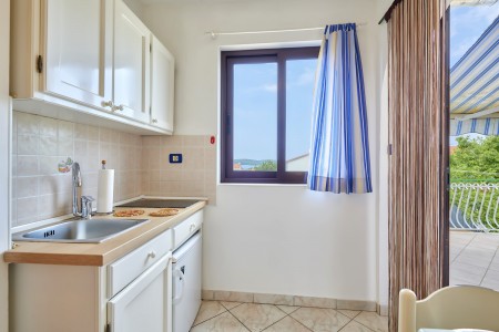 1 apartman za 2 osobe AP3: zaseban ulaz, ca. 20 m², na prvom katu. Jedna spavaća soba s bračnim krevetom, kuhinjska niša sa stolićem, klima, kupaona (tuš/WC), terasa (ca. 30 m²).