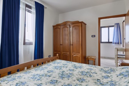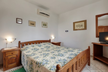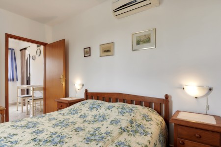 1 apartman za 2 osobe AP2: zaseban ulaz, ca. 55 m² u prizemlju. Jedna spavaća soba s bračnim krevetom (150 x 200 cm) i ventilatorom, zasebna kuhinja, dnevni boravak s klimom, kupaona (tuš/WC) i još jedan WC, terasa.