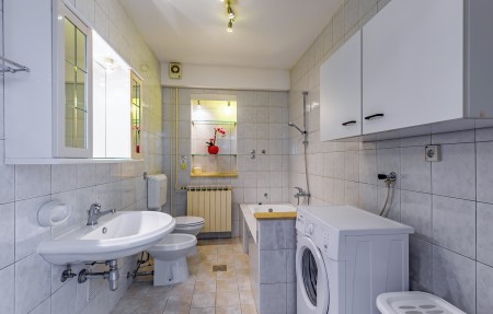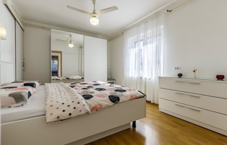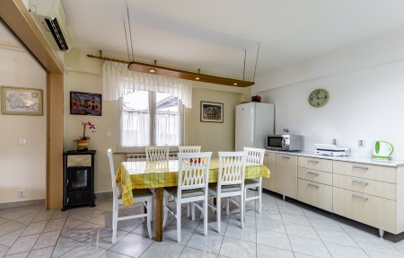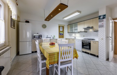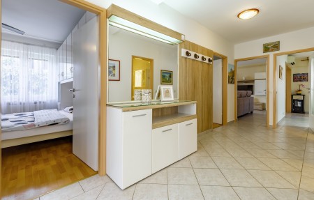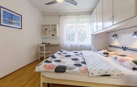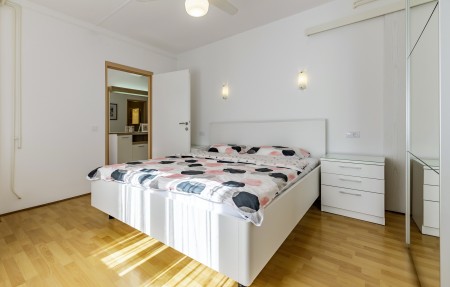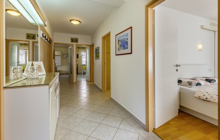 Apartman za 6 osoba: ca. 120 m², u prizemlju, s vlastitim ulazom. Apartman nudi prostranu, potpuno opremljenu kuhinju s blagovaonicom i klima uređajem, dnevni boravak s udobnim kaučem, tri spavaće sobe s bračnim krevetima, kupaonicu (kada/WC) te još jednu kupaonicu (tuš/WC). Također, na raspolaganju je velika natkrivena terasa sa stolom, stolicama i pogledom na mali vrt.