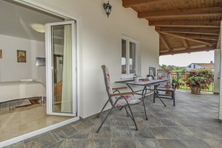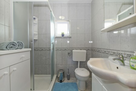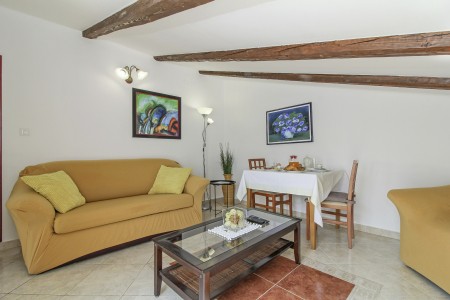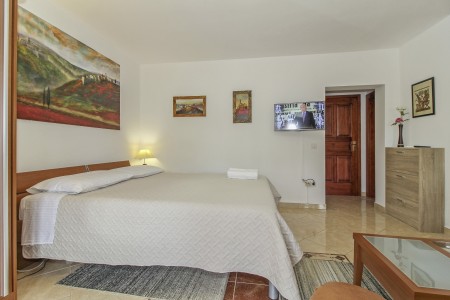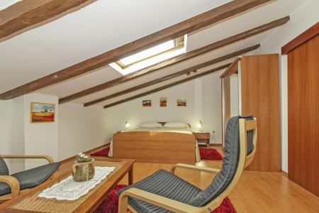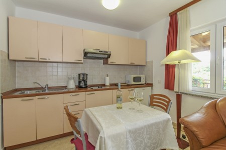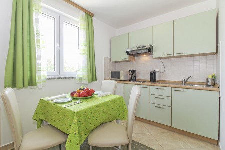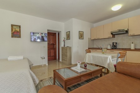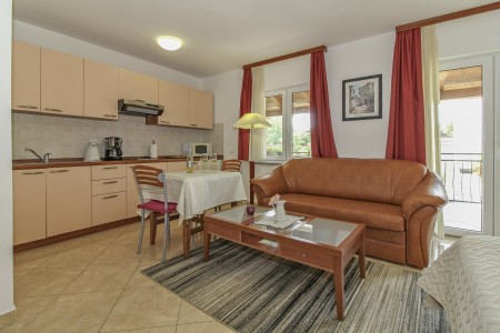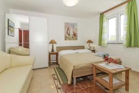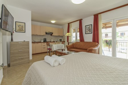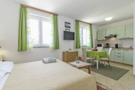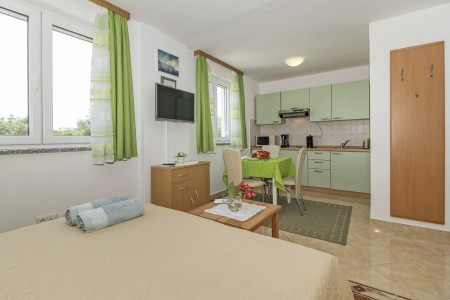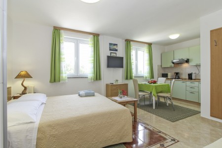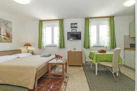 1 studio za 2 osobe ST2: ca. 25 m², na prvom katu. Dnevno-spavaći prostor s bračnim krevetom (160 x 200 cm) i klima uređajem, kuhinjska niša s blagovaonskim stolom, kupaonica (tuš/WC). Studio ima i natkriveni balkon sa sjedećom garniturom, kojem se pristupa kroz glavni ulaz. Smještaj je namijenjen isključivo odraslima.