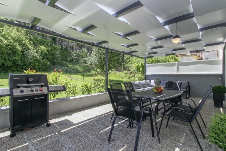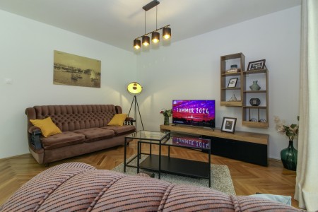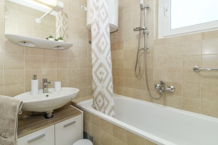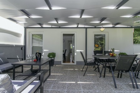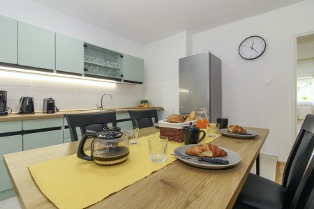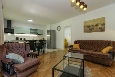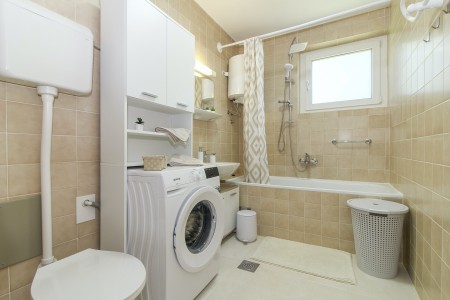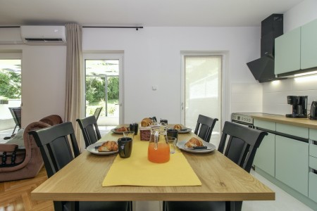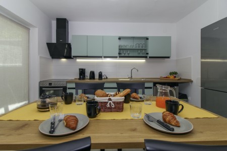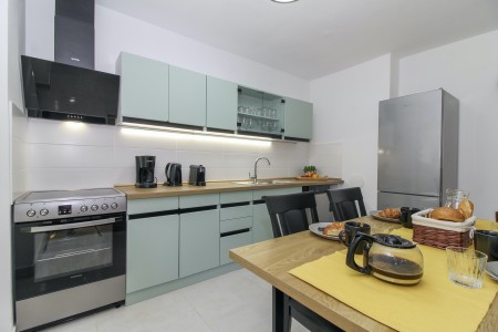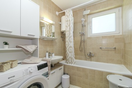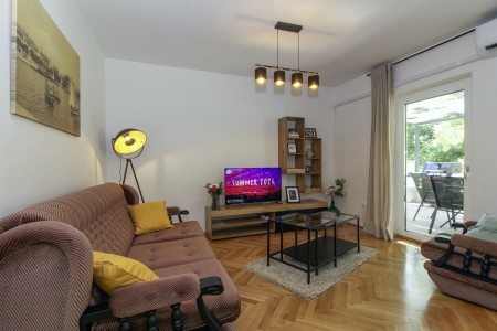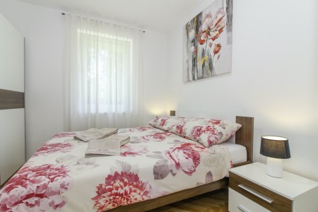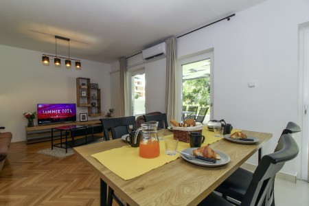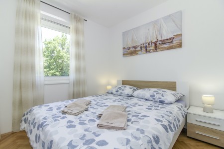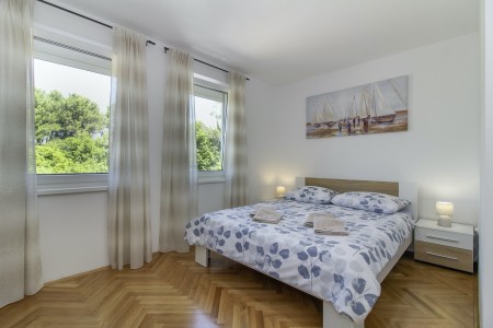Apartman za 4-5 osoba: cca. 60 m² stambene površine s velikom terasom (cca. 30 m²) i ograđenim dvorištem. Apartman se nalazi u prizemlju i sastoji se od prozračnog dnevnog boravaka s klima uređajem, kauča na razvlačenje, blagovaonice i moderno opremljene kuhinje. Također, dvije spavaće sobe s bračnim krevetom, udobnog kutka za čitanje i kupaonice (kada/WC).
